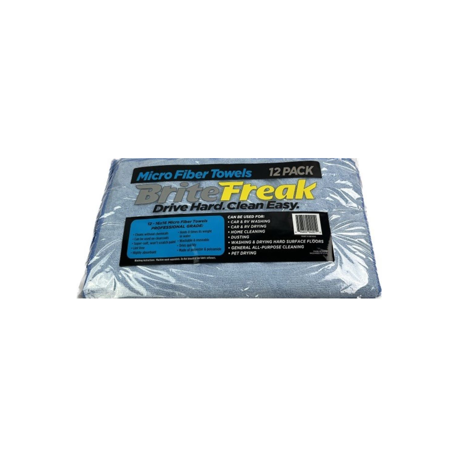 Brite Freak’s® Micro Fiber Cloths are the ultimate cleaning and drying cloth for your vehicle. Brite Freak's® Micro Fiber Cloth cleans without chemicals and absorbs over 8 times its weight in water! It’s washable and re-usable, won’t scratch paint and leaves a streak free finish. Can be used for drying your vehicle after washing with Brite Freak's® RainMagik®, Made of Polyester and Polyamide.
